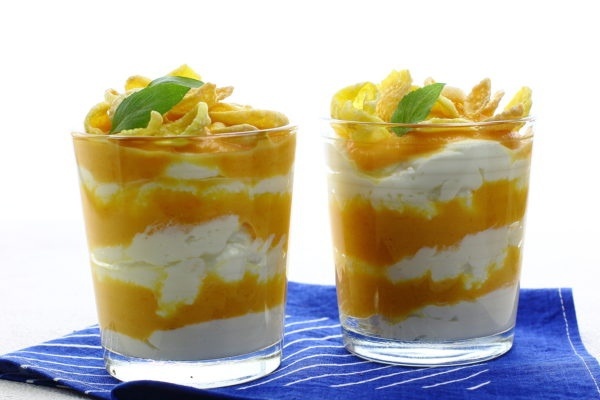 Теперь взять кондитерский мешок и начинить его творожной массой. Подготовить стаканы или креманки и аккуратно выдавить слой творога на дно. Сверху налить тыквенное пюре.