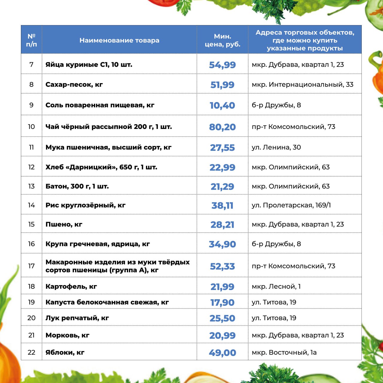 В карточках указаны цены на основные продукты питания и адреса магазинов. Буду рад, если они помогут вам при планировании покупок.