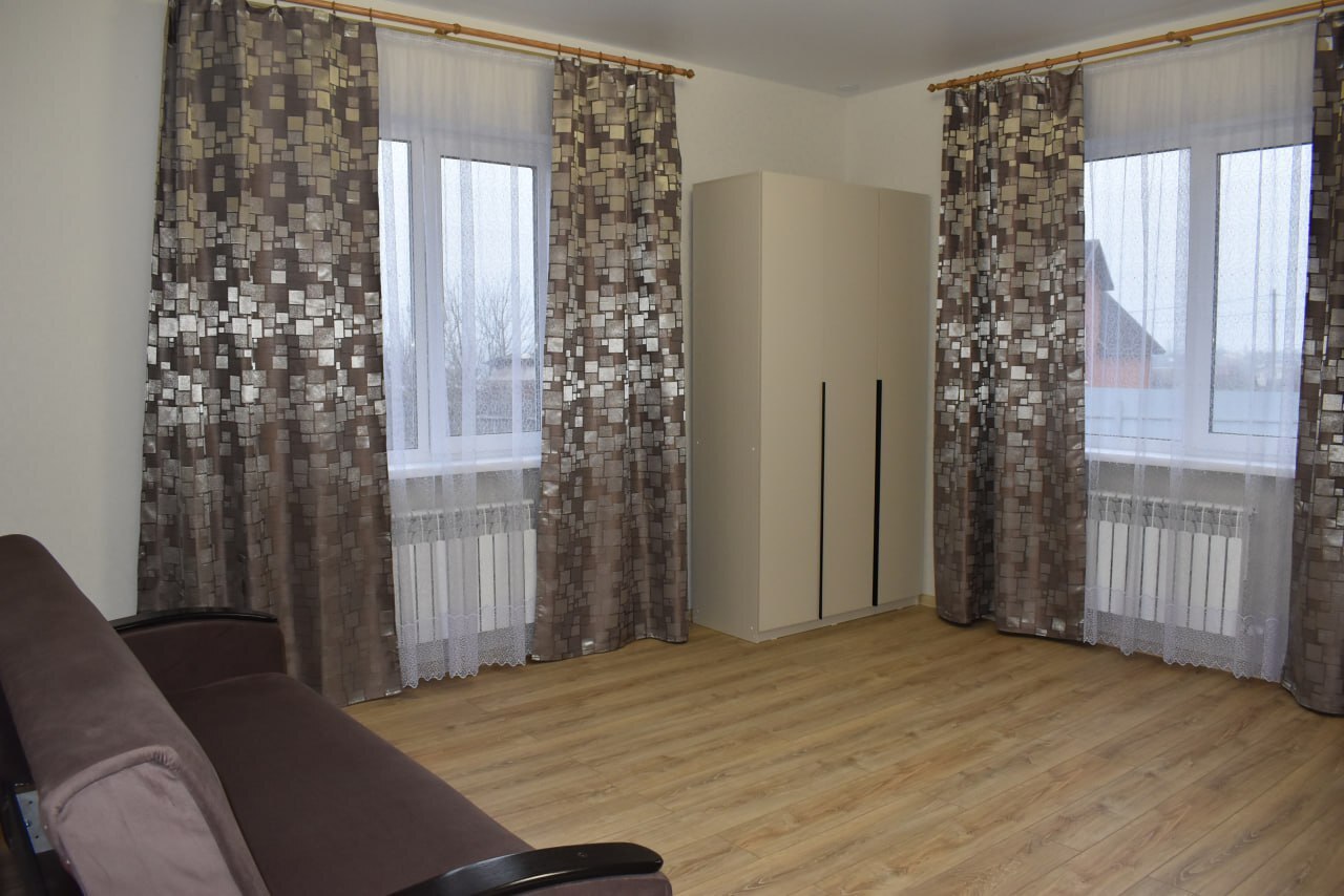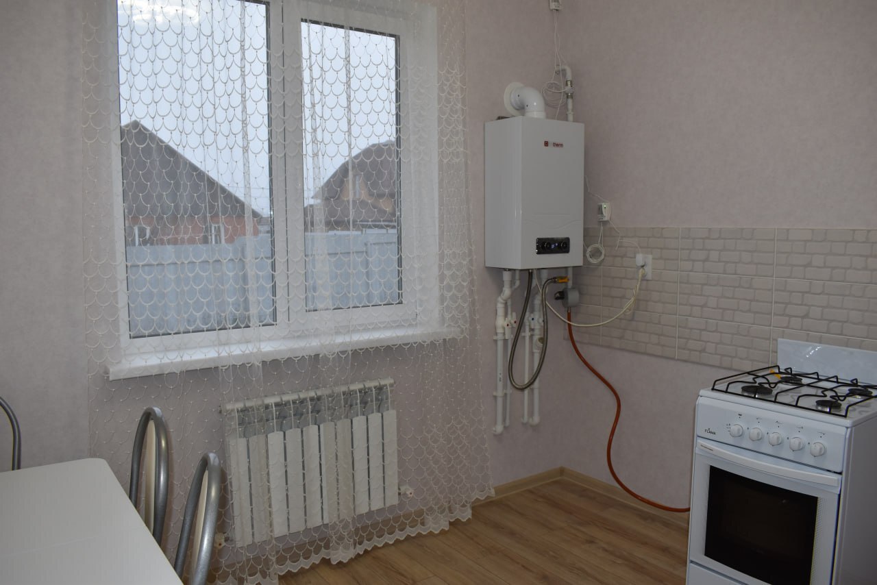 В его новой уютной квартире есть всё необходимое для жизни: удобная мебель, шторы, современная сантехника и кухонная плита.