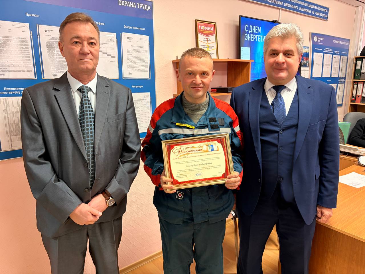 В ходе встречи мы отметили труд некоторых специалистов. Благодарственное письмо было вручено Татьяне Валентиновне Семибратовой — инженеру 1 категории отдела маркетинга и взаимодействия с клиентами. Благодарность за добросовестный труд и высокий профессионализм получил Иван Владимирович Ковалёв — электромонтёр по эксплуатации распределительных сетей 5 разряда.