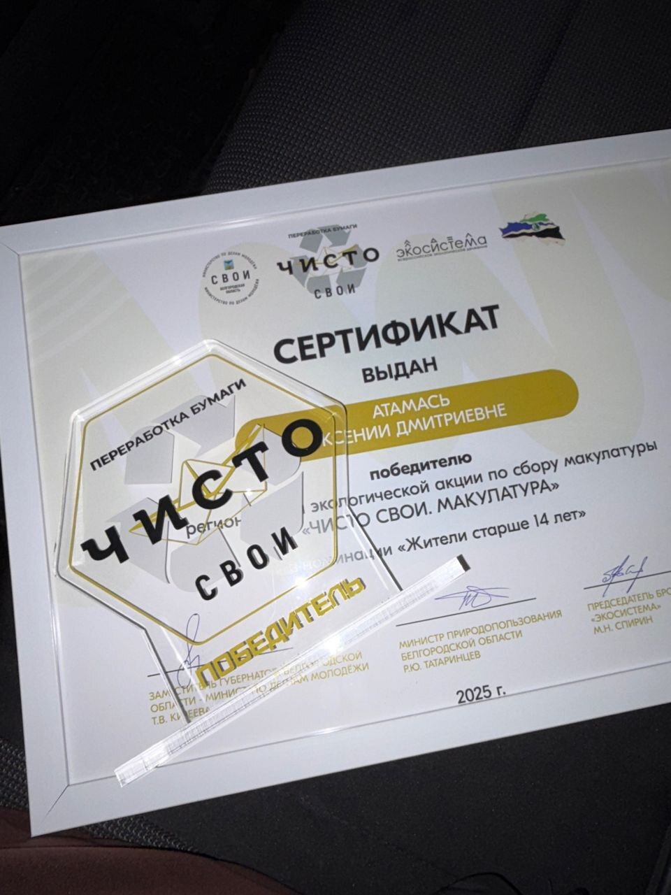 В ходе акции «ЧИСТО СВОИ.МАКУЛАТУРА» ракитянцы отправили на переработку более 750 килограммов бумаги. Победителем в личном зачёте стала ученица Ракитянской школы №1 Ксения Атамась. Министр по делам молодёжи региона Татьяна Киреева поблагодарила её и вручила сертификат и памятную статуэтку. Всего жители области собрали более 32 тонн макулатуры.