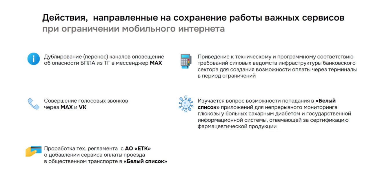 Министр цифрового развития Сергей Четвериков отметил, что анализ обращений показал: людей больше всего беспокоит невозможность получить оповещения о воздушных угрозах, оплата банковских и транспортных услуг.