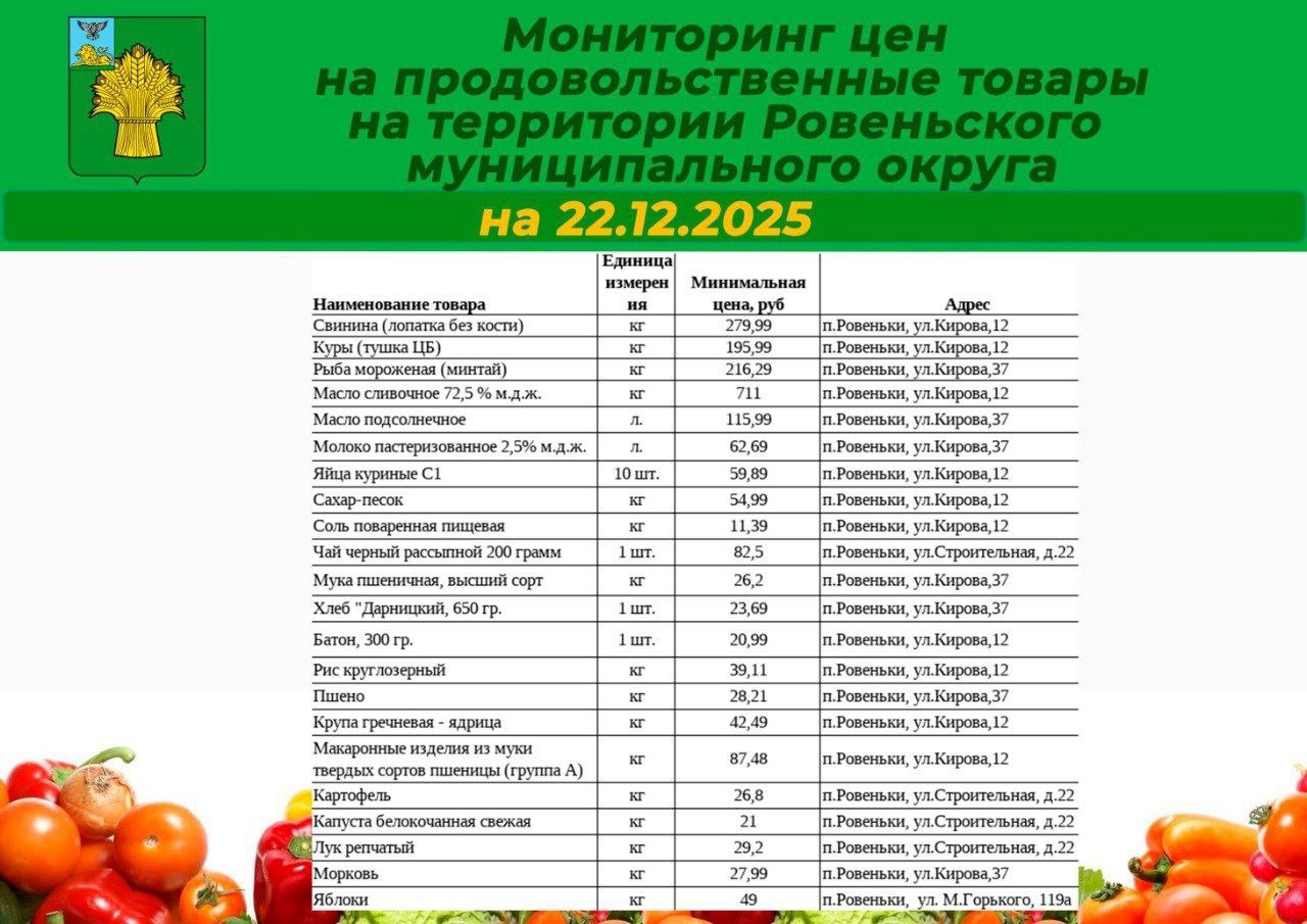 Делюсь с вами подборкой цен на социально значимые продукты на территории Ровеньского муниципального округа по состоянию на 22 декабря 2025 года.