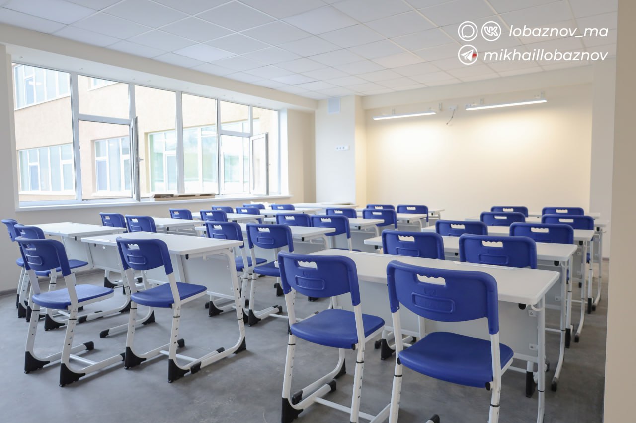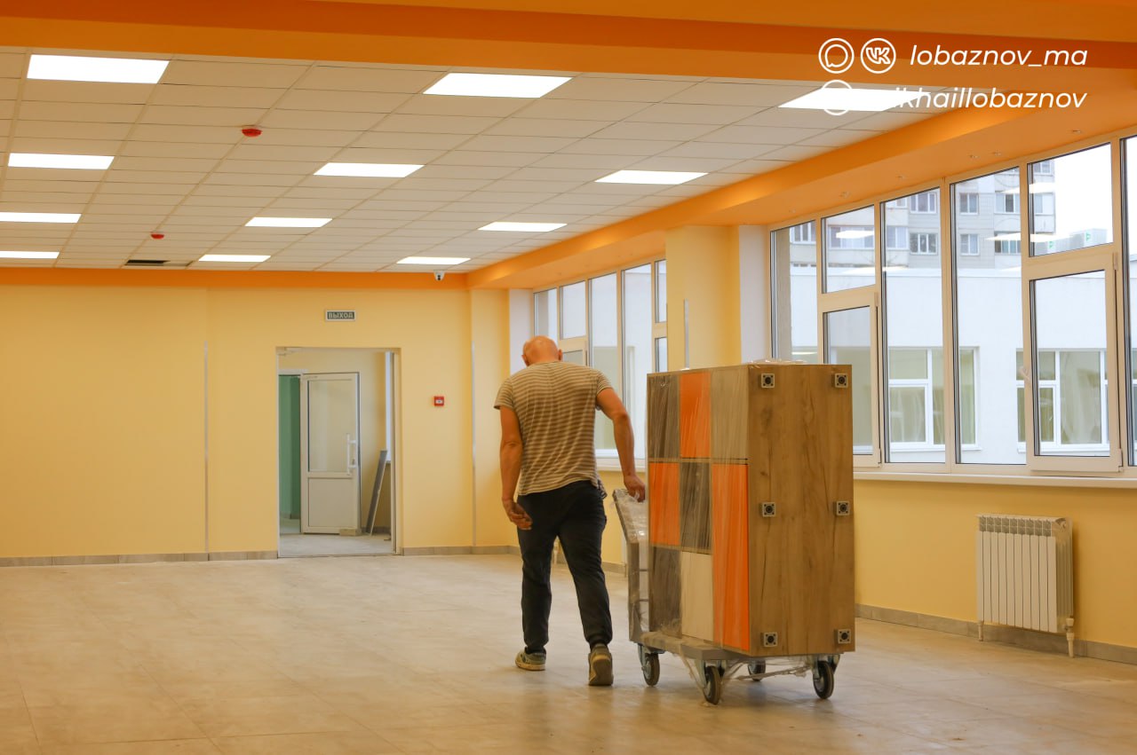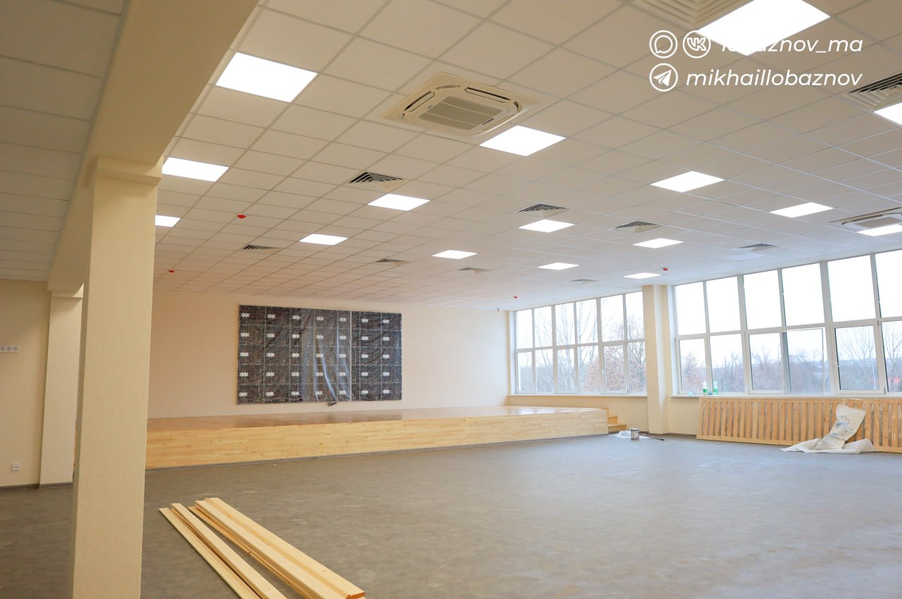 Кабинеты, учебные классы, места общего пользования, учительскую постепенно обустраивают новой мебелью, партами, стульями, досками. В спортивном зале уже появился скалодром. Там же сейчас наносится разметка. Учитель физкультуры непосредственно участвует в процессе, помогает строителям не допустить неточностей. Всё должно быть на высшем уровне.