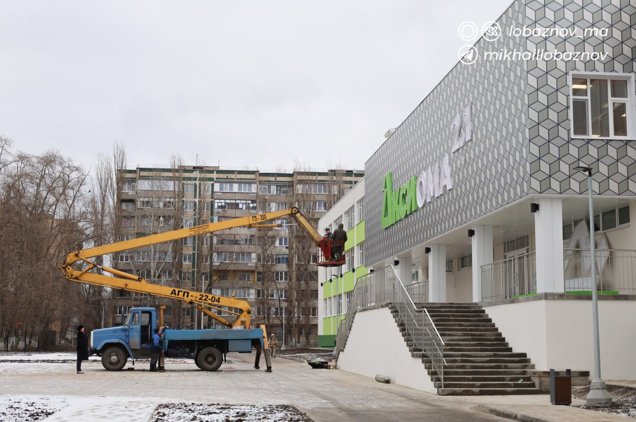Вчера начали монтаж нового логотипа школы. Он будет расположен над центральным входом, а также на фасаде со стороны улицы Матросова. Осталось собрать кубообразный потолок в коридорах и раздевалках, подключить системы видеонаблюдения, пожарно-охранную сигнализацию и установить защитные экраны на радиаторы.
