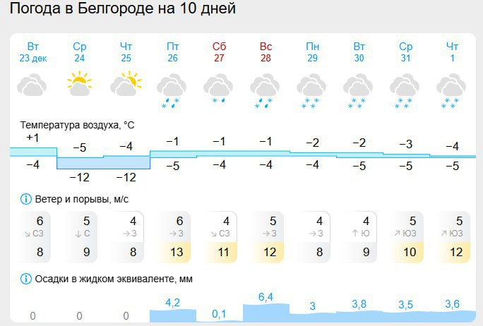 Пик морозов придётся на среду и четверг. Днём температура опустится до –4…–5 °C, а ночью – до –12 °C. В выходные прогнозируется небольшое потепление: около –1 °C днём и до –4 °C ночью, возможен снег с дождём.
