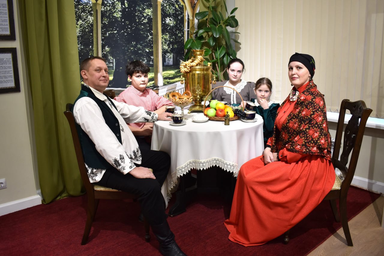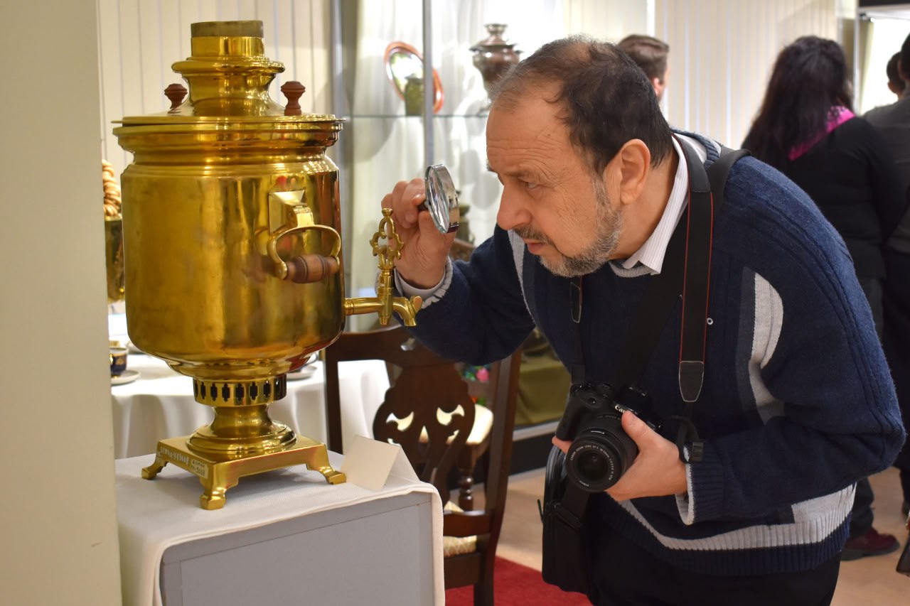 На первой театрализованной экскурсии по выставке гостям представилась возможность познакомиться с историей появления самоваров в России, увидеть отражение символа в литературе, искусстве, декоративно-прикладном творчестве и кино, а также познакомиться с коллекцией тематических открыток, собранной сотрудницей музея Зинаидой Медведковой.