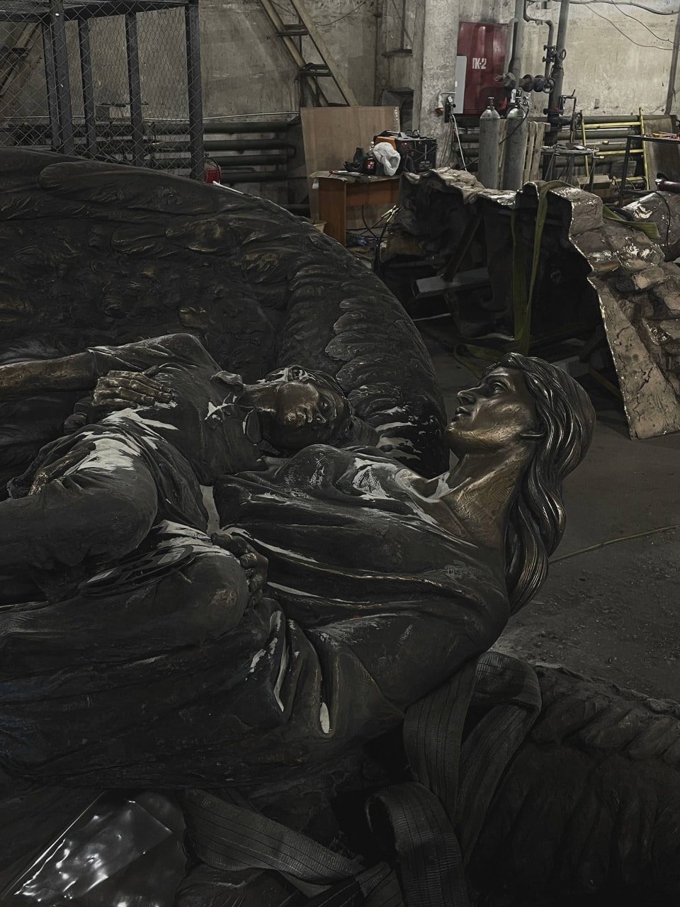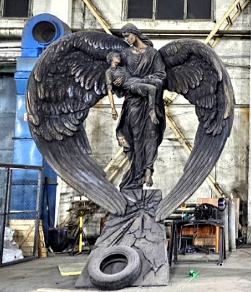 Высота бронзового мемориала – пять метров, а вес – около четырёх тонн. В его центре – ангел, бережно держащий ребёнка. Крылья скульптуры образуют форму сердца и покрыты ранами.