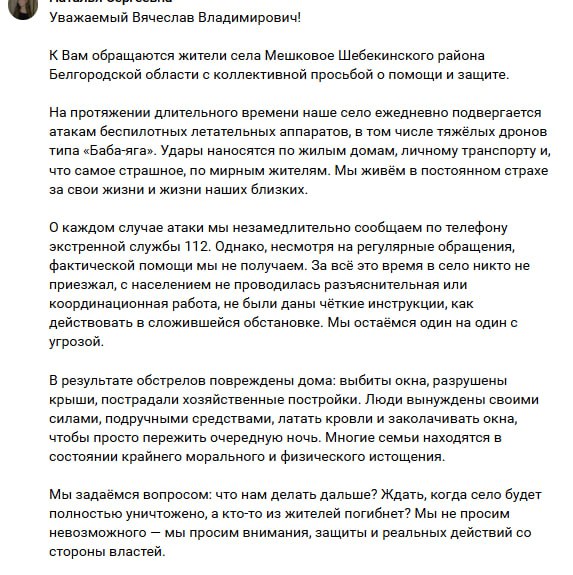 В соцсетях губернатора они пожаловались на частые атаки беспилотников «Баба-Яга», разрушения, отсутствие фактической помощи и инструкций, как действовать в случае опасности.
