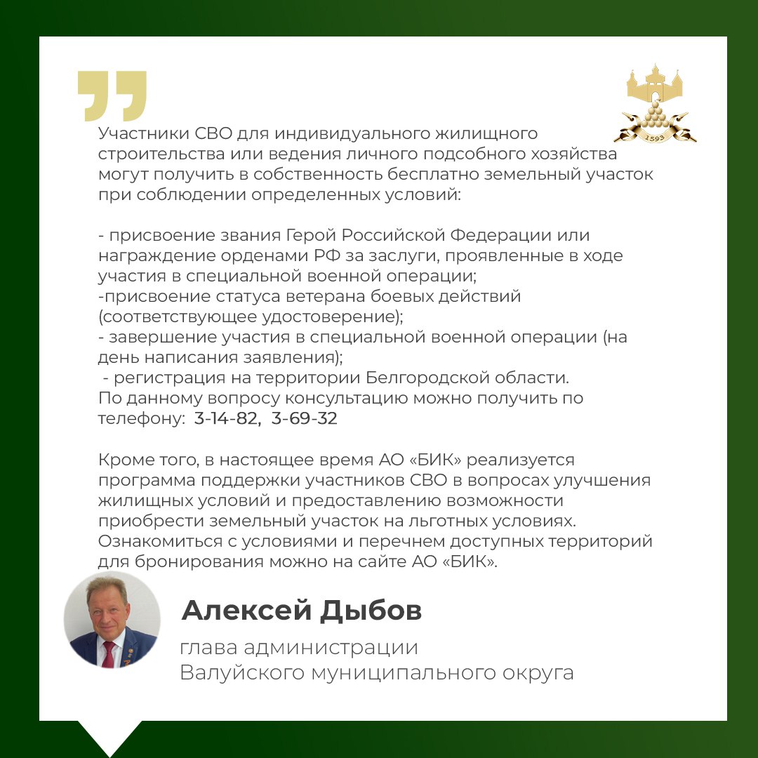 Глава администрации Валуйского муниципального округа Алексей Дыбов во время расширенного прямого эфира рассказал, как получить в собственность бесплатно земельный участок участникам СВО для индивидуального жилищного строительства либо ведения личного подсобного хозяйства.