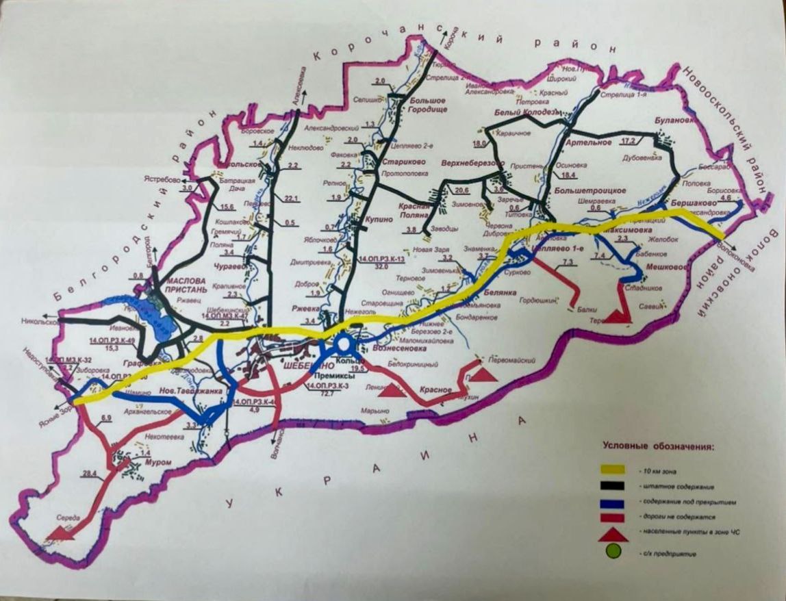 Синяя зона: дороги в районах, подверженных обстрелам. Их очистка будет проводиться в зависимости от оперативной обстановки и под прикрытие .