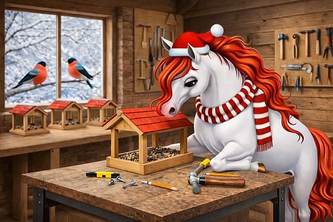 В наш любимый город пришла холодная зима. Белогорочка не сидит на месте, у неё уже готов план по спасению птичьего мира. Наша лошадка помогает своим пернатым друзьям – делает кормушки.