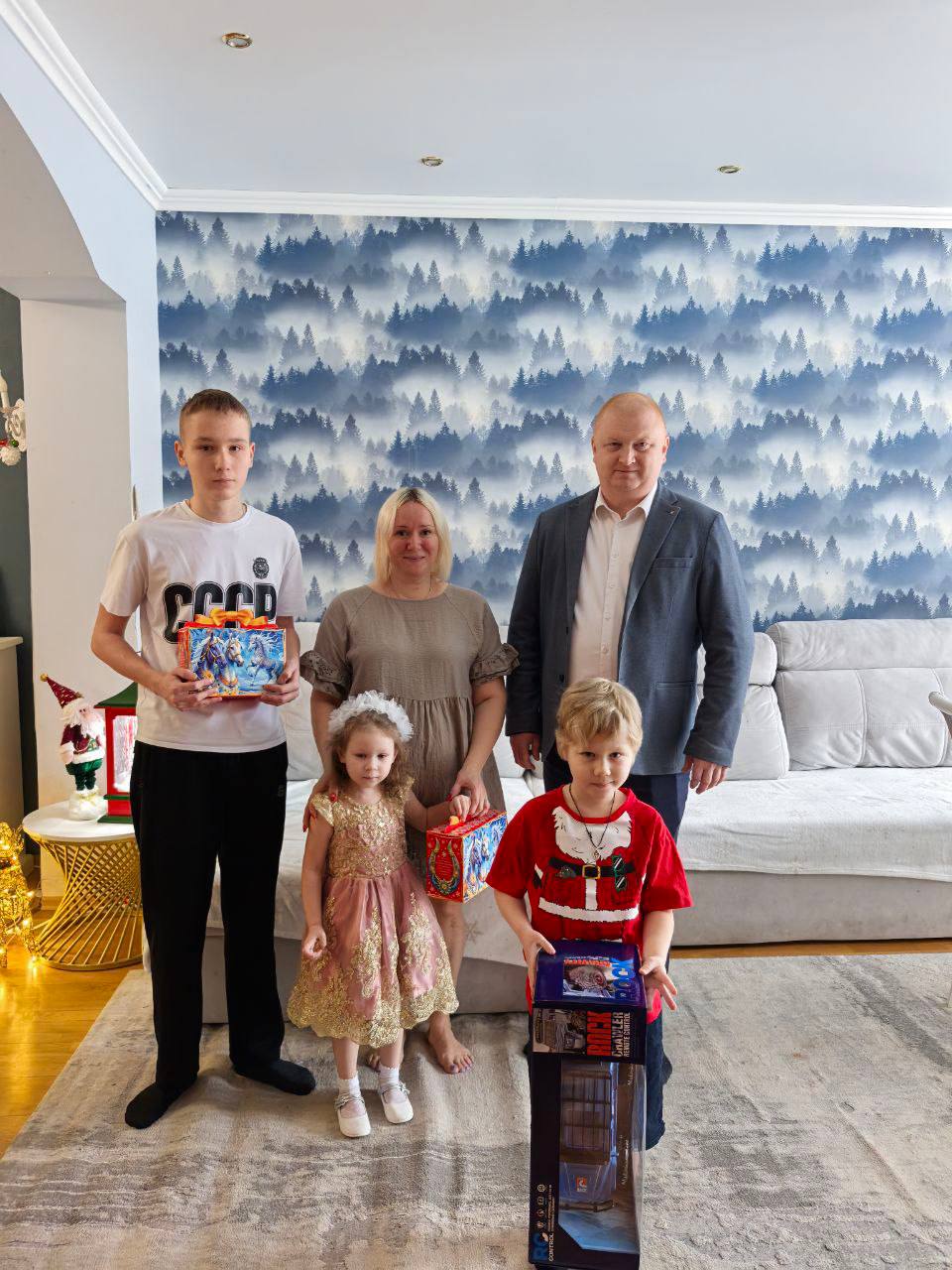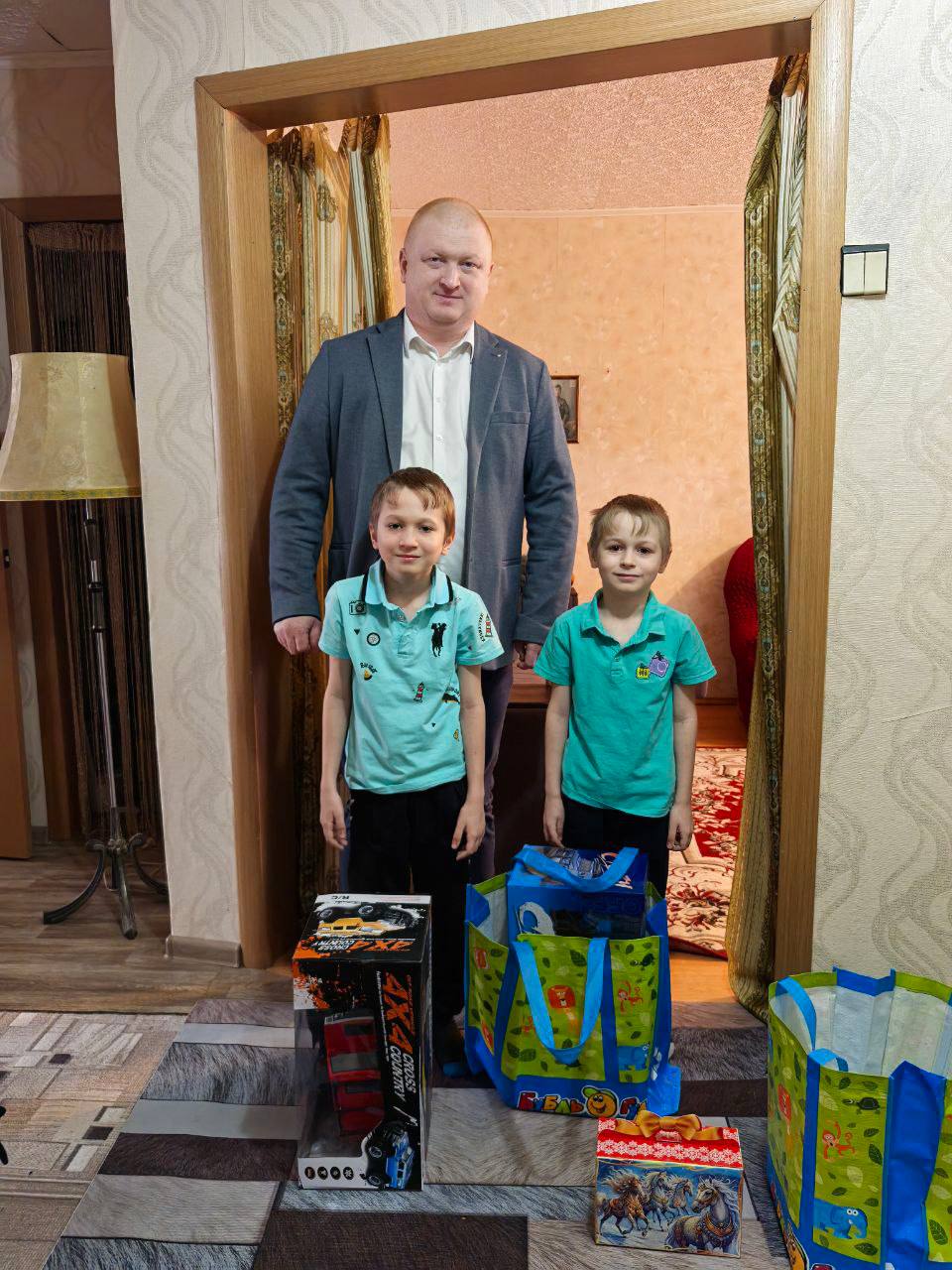 Валентина Тимофеевна из села Никоноровка воспитывает двух внуков, Артура и Сашу. Поздравил ребят, подарил машинки на пульте управления. После встретился с Мишей из Старого Оскола, оказалось, что в семье еще два ребенка, брат и сестра, конечно, сюрпризы приготовил для каждого.