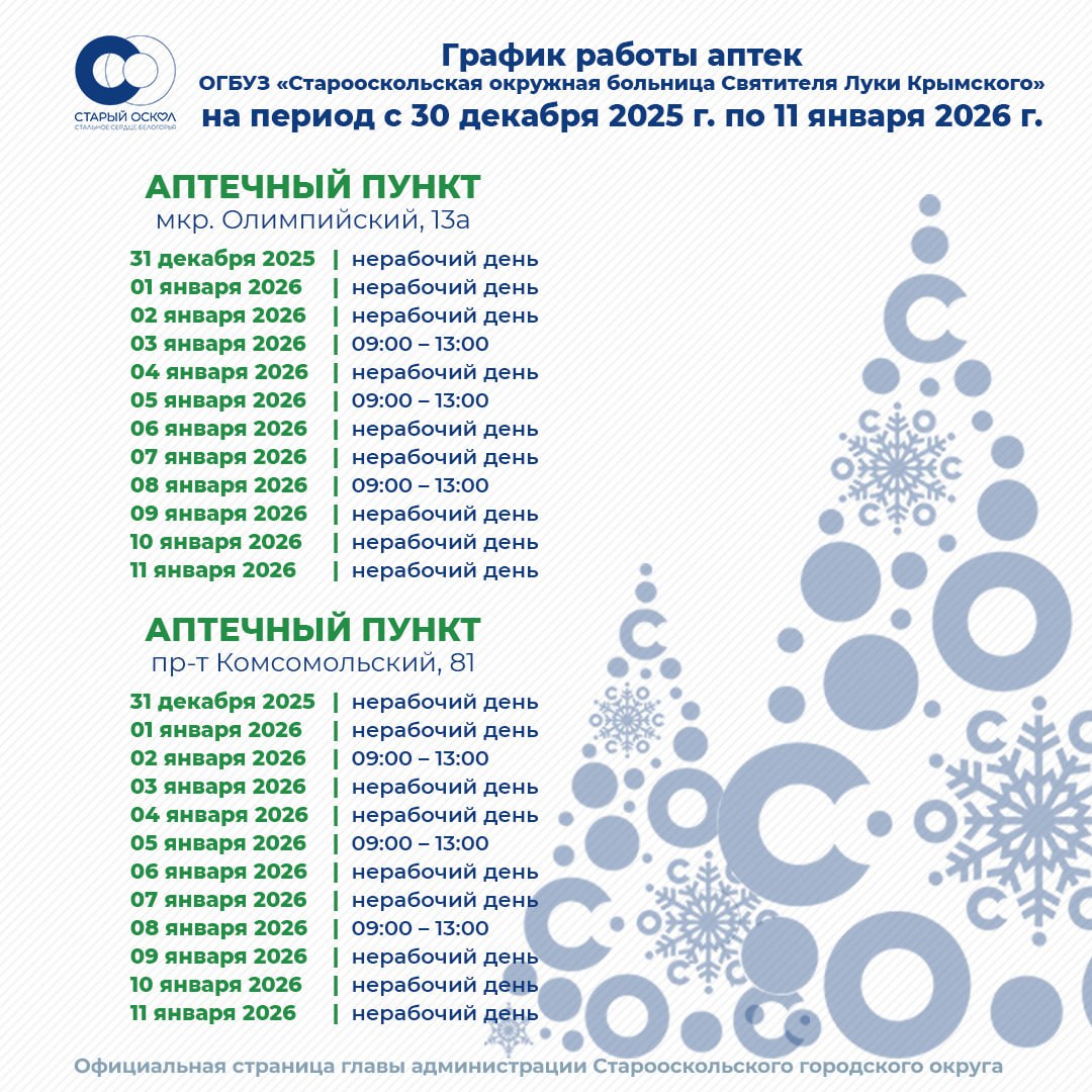 «Старооскольская окружная больница Святителя Луки Крымского» сообщает об изменении графика работы поликлиники и аптек в период новогодних праздников.