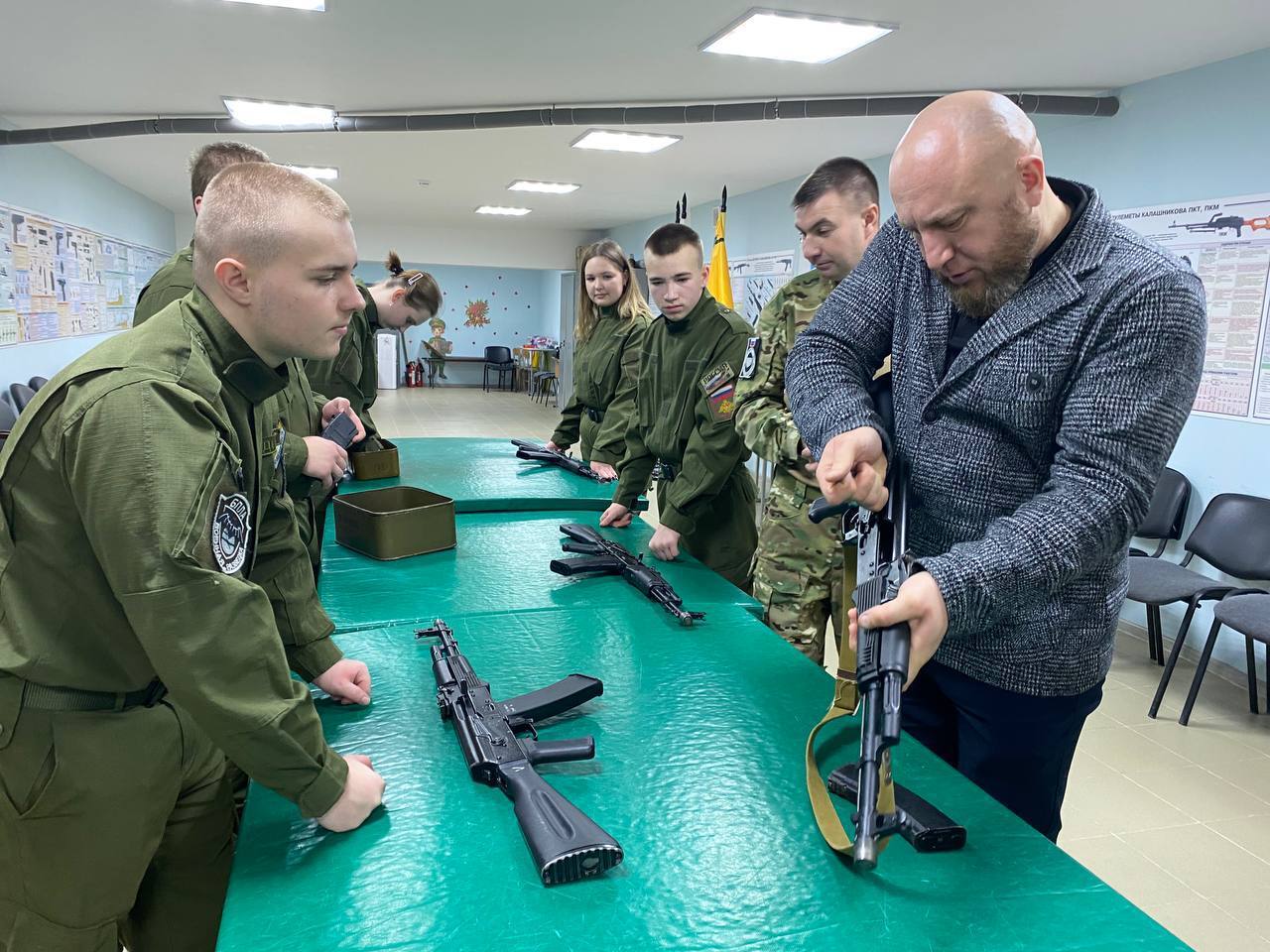 Глава муниципалитета с интересом посетил занятия в классе огневой подготовки. Он стрелял из пневматической винтовки и наблюдал, как ребята ловко собирают и разбирают автоматы.