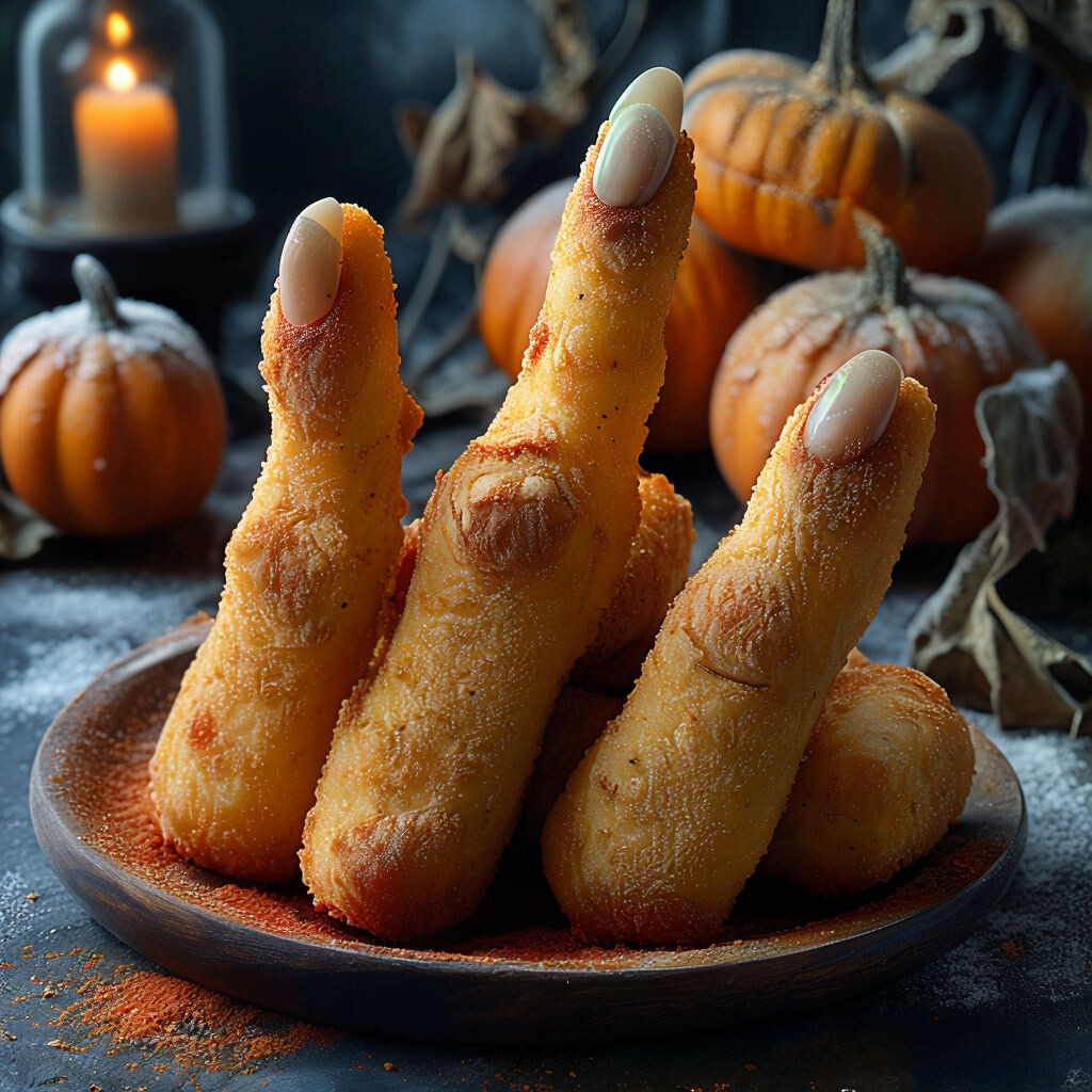 - Пальцы ведьмы: Хрустящие сырные палочки с орехами, которые выглядят как настоящие пальцы. Эти закуски будут радовать как глаз, так и желудок. Для их приготовления потребуется сыр, мука, сливочное масло и миндаль, который станет «ногтем». Выпекайте до золотистой корочки.