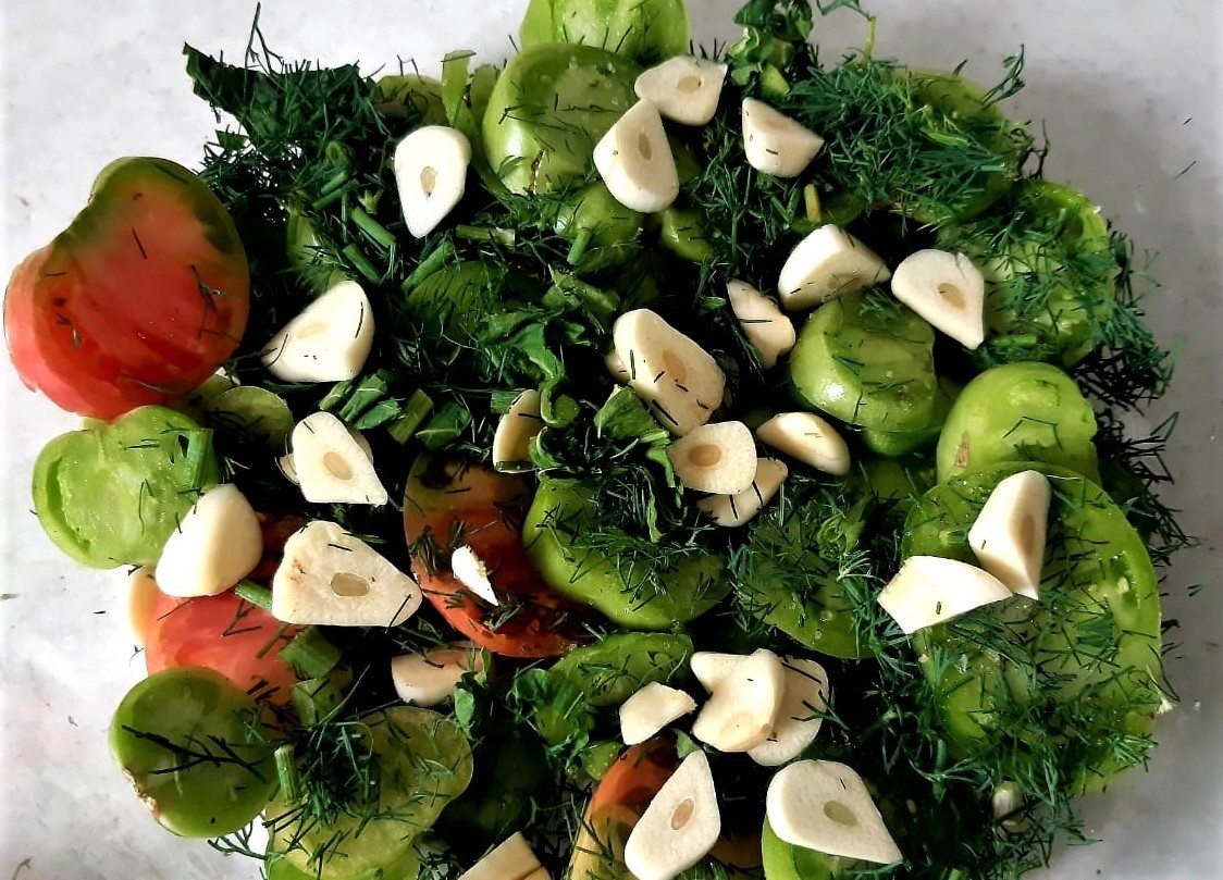 Чеснок и перцы нарезаются мелкими кусочками, а зелень измельчается в блендере или просто ножом. Эта ароматная смесь затем равномерно распределяется по слоям помидоров.
