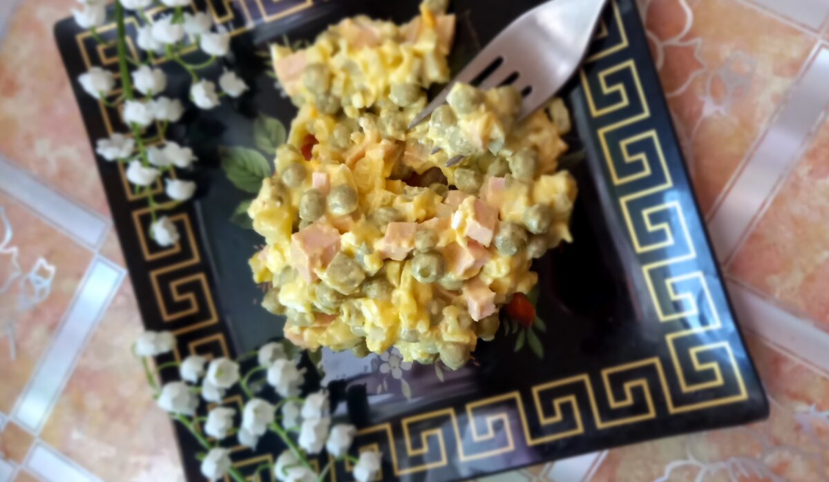 Теперь пришло время добавить консервированный горошек и нашинкованную колбасу. Главное — тщательно перемешать все ингредиенты, чтобы они успешно соединились. По желанию, можно подсолить, а затем заправить майонезом. Такой подход не только сэкономит время, но и украсит любой праздник.