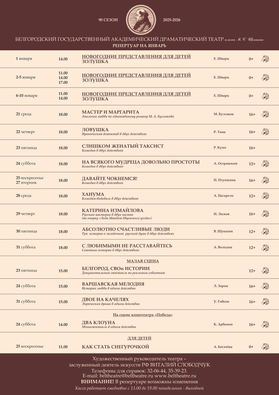 Белгородский театр им. М.С. Щепкина опубликовал афишу на январь и февраль