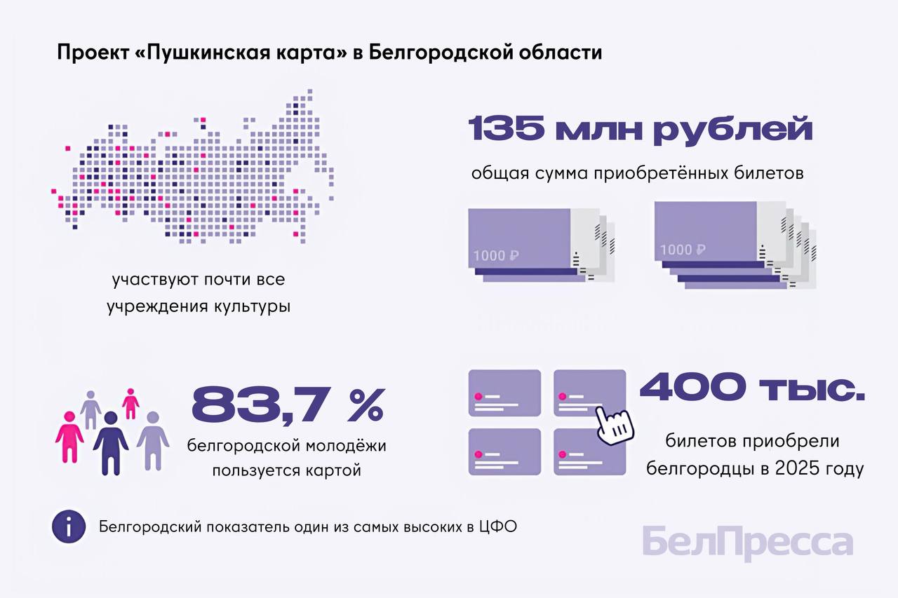 Проект «Пушкинская карта» запустили в 2021 году по инициативе президента. Он позволяет бесплатно посещать – театры, музеи, филармонии, кинотеатры, концертные площадки. Более 1,5 млн раз белгородцы воспользовались картой с начала действия проекта.