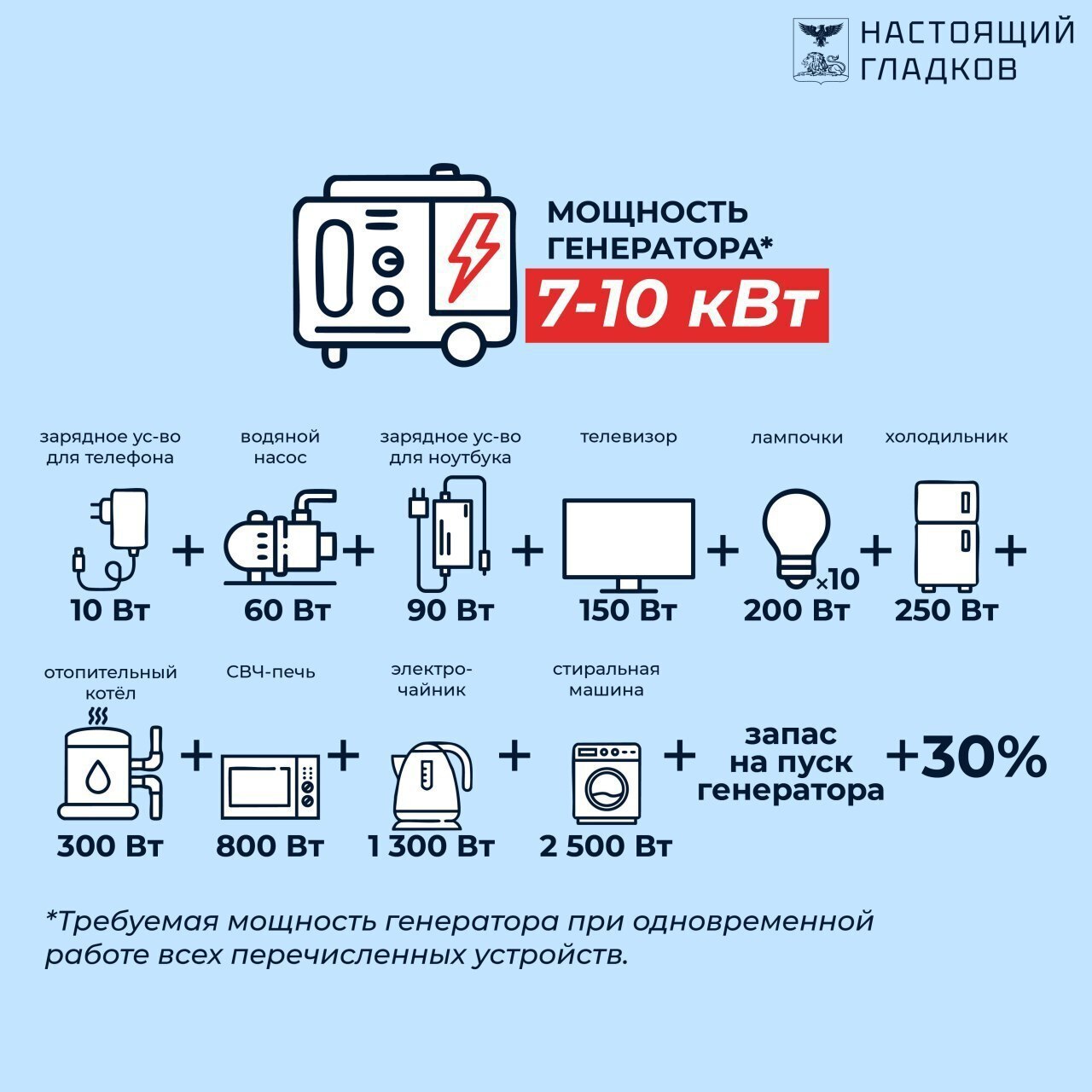 Необходимо отталкиваться из объёма потребляемой мощности и приборов, которые будут подключены к сети. Важно, чтобы суммарная мощность приборов не превышала номинальную мощность генератора.