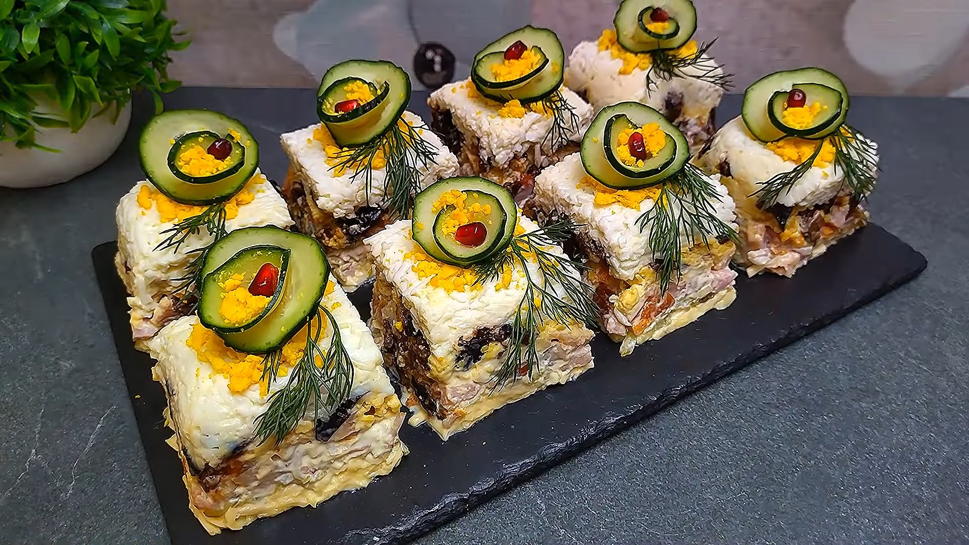 Сначала — белки, затем — чернослив и желтки, далее — мясо с маринованным луком, после — огурцы и, наконец, тертый сыр.