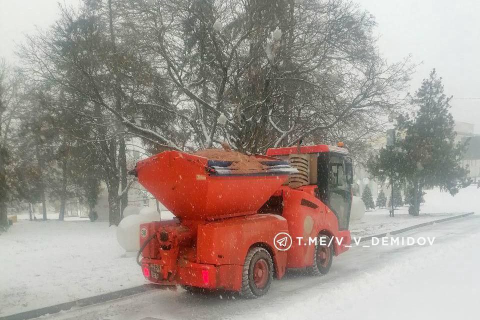 На маршрутах – 52 единицы спецтехники и около 460 человек. Они расчищают снег, обрабатывают дороги и тротуары противогололёдными материалами.
