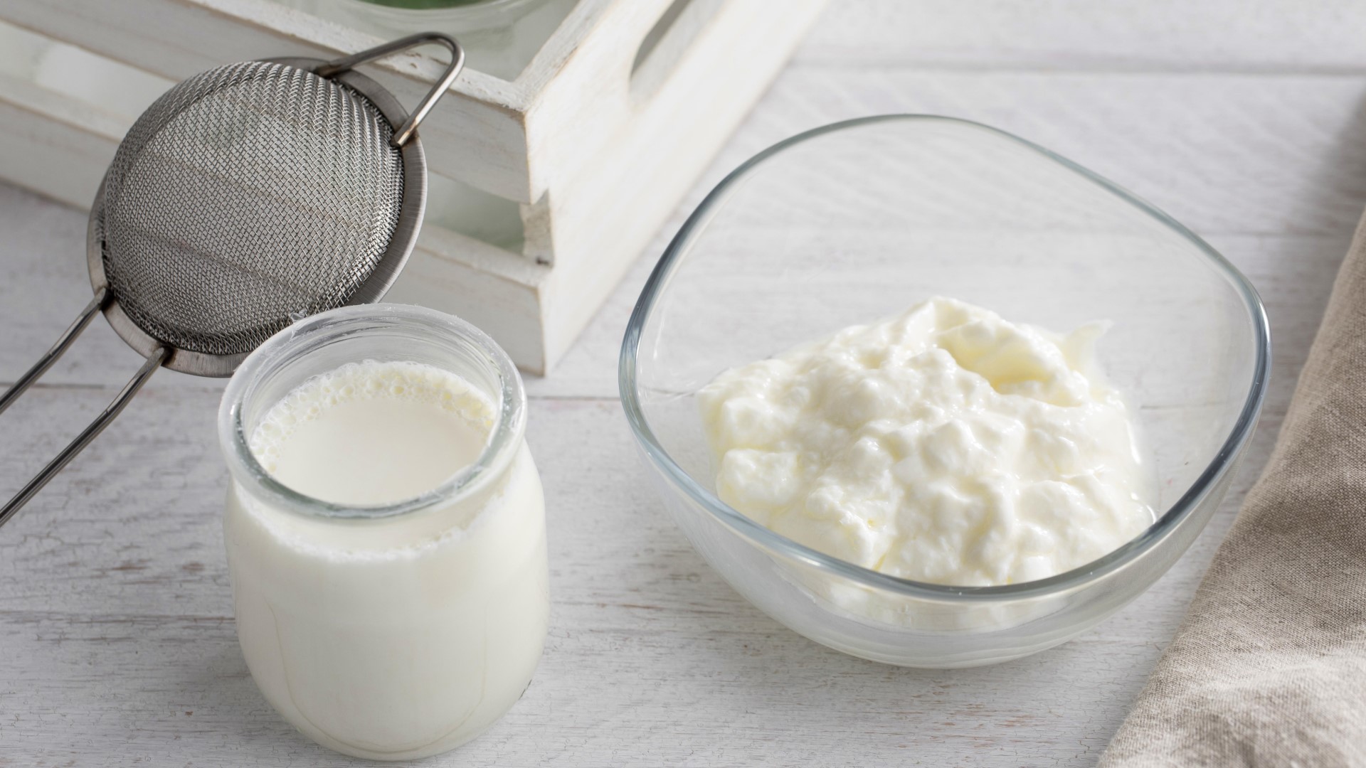 Простоквашу нужно заморозить. Затем достать и переложить на дуршлаг, покрытый марлей в четыре слоя, и дать полностью оттаять.