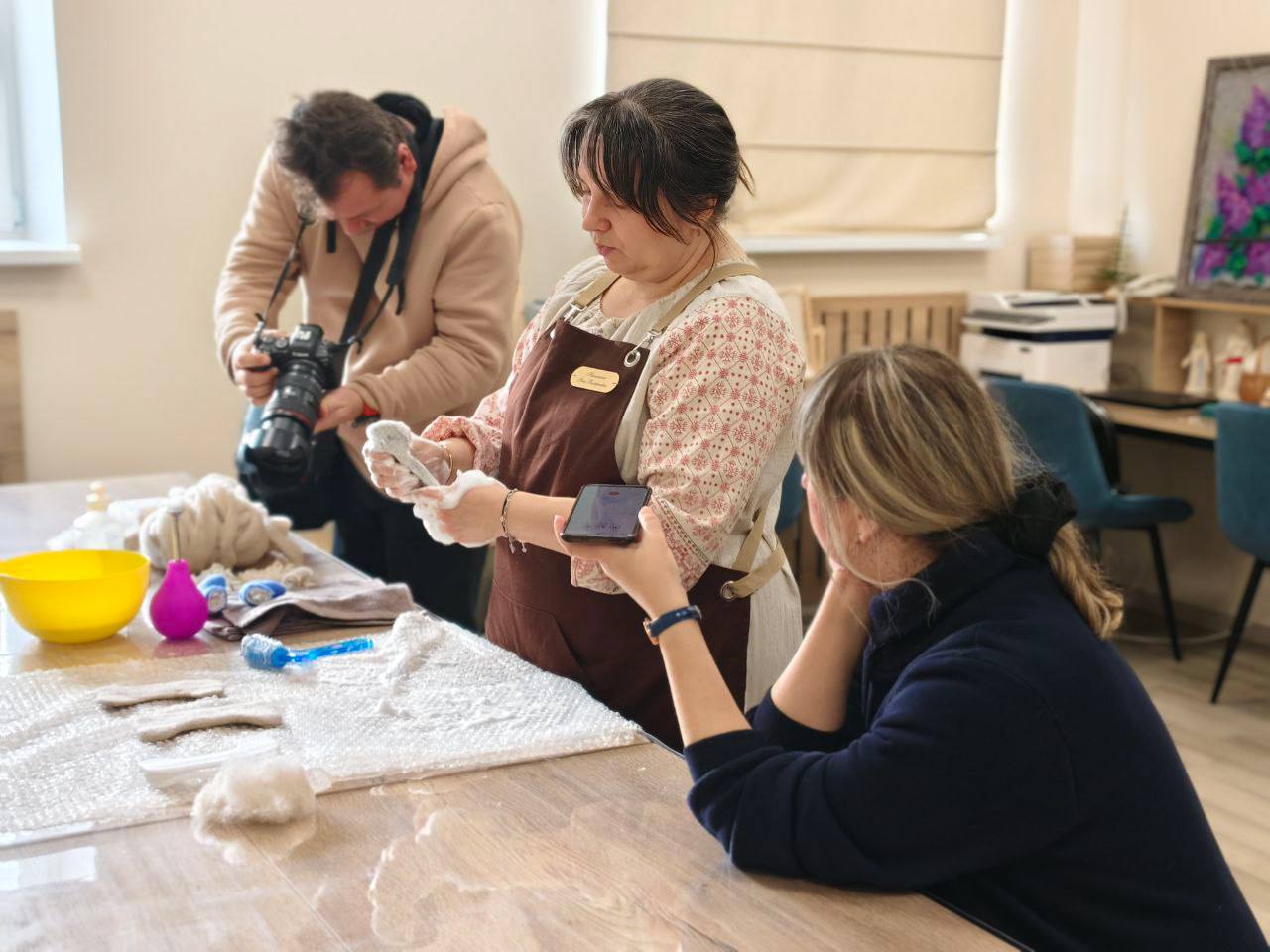 Для гостей были организованы тематические мастер-классы по ключевым направлениям деятельности: гончарному делу, резьбе по дереву, валянию из войлока и художественному текстилю.