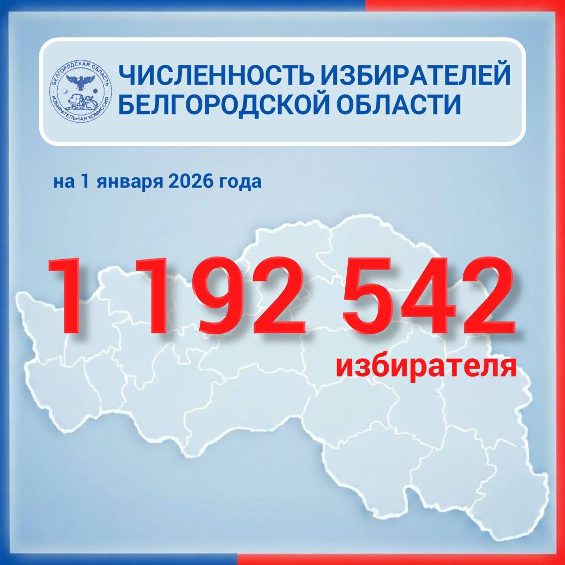 На сегодняшний день на территории Белгородской области зарегистрировано 1 192 542 избирателя. Именно в соответствии с этой цифрой определяется количество бюллетеней на предстоящих выборах.