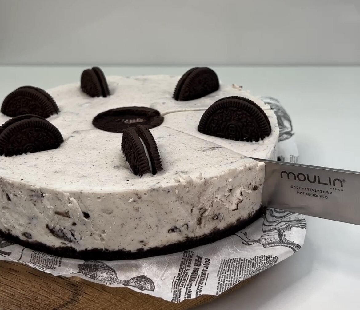 Форму для чизкейка нужно предварительно застелить пленкой, а затем уложить массу из печенья, сверху выложить начинку и снова немного Орео для оформления. После этого оставьте чизкейк в холодильнике на 2-3 часа.