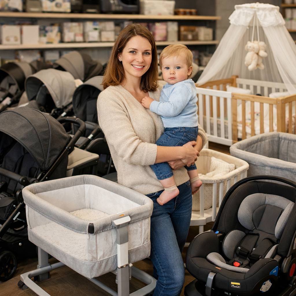 Это коляски всех видов, манежи, стулья для кормления, автолюльки, автокресела и кроватки с матрасами.