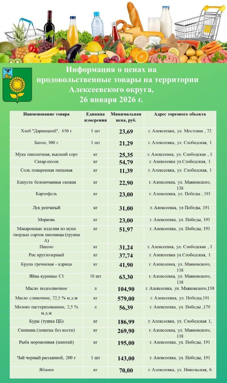 Представляем вашему вниманию обновлённый перечень минимальных цен на продовольственные товары в городе Алексеевка.