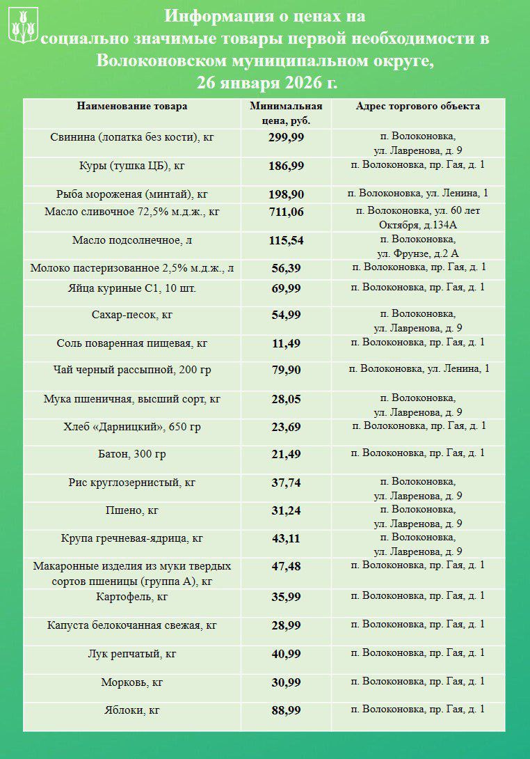 Уважаемые волоконовцы!. Информирую вас о ценах на продовольственные товары из базовой потребительской корзины, складывающихся в нашем муниципалитете на сегодняшний день