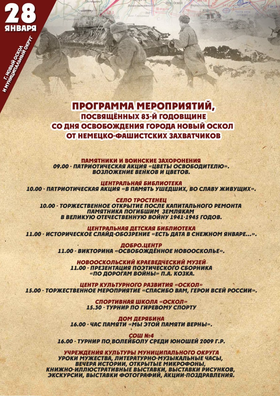 Уважаемые новооскольцы!. Делимся с вами программой мероприятий, посвящённых 83-й годовщине со Дня освобождения города Новый Оскол от немецко-фашистских захватчиков