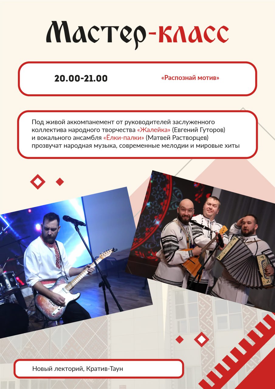 Под живой аккомпанемент от руководителей «заслуженного коллектива народного творчества» ансамбля народных инструментов «Жалейка» (Евгений Гуторов) и вокального ансамбля «Ёлки-палки (Матвей Растворцев) прозвучат народная музыка, современные мелодии и мировые хиты.