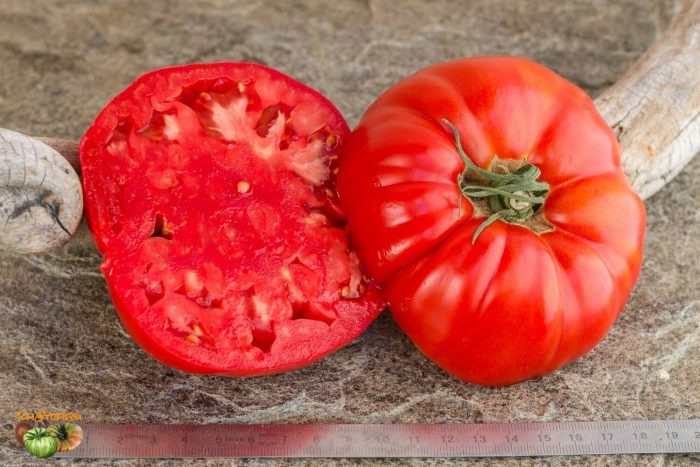 Плоды имеют плоскоокруглую форму и глубокий красный окрас. Мякоть плотная, с минимальным содержанием пустот, что обеспечивает хороший вкус и транспортируемость. Насыщенная сладость без выраженной кислинки делает их одинаково уместными в сырой снедени и в соусах.