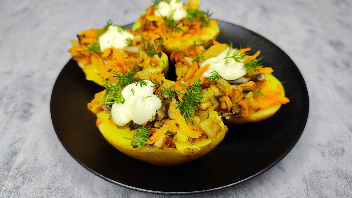 Порой простой вечер складывается из минут и запаха запечённого блюда, которое звучит как домашний уют. В таком ощущении как раз скрыт смысл этой идеи: картофель становится основой, вокруг него загораются овощи и грибная начинка, создавая насыщенный вкус без мясной основы.