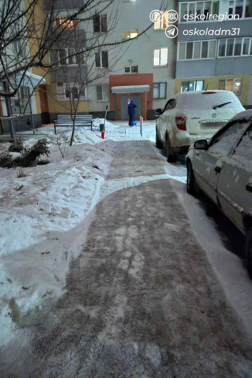 С шести утра сотрудники коммунальных служб с задействованием малой техники начали обработку пешеходных зон песком и реагентами.