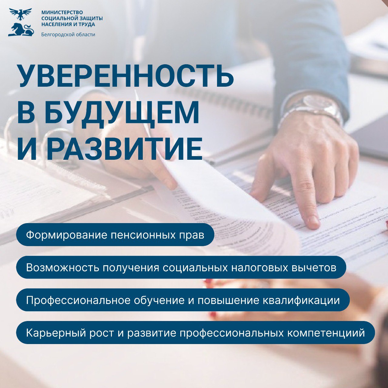 Ознакомиться с ключевыми преимуществами официального трудоустройства можно в карточках министерства социальной защиты населения и труда Белгородской области.