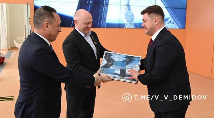 Антон Шкаплеров и Олег Артемьев посетили Белгород 30 января. В БГТУ им. Шухова с космонавтами встретился мэр города Валентин Демидов. Они передали ему особенный подарок – флаг, который побывал в космосе.