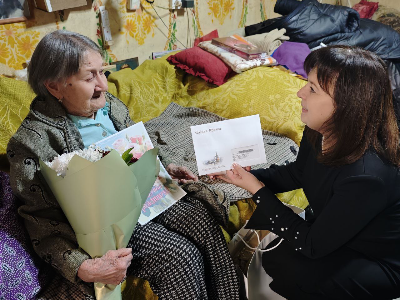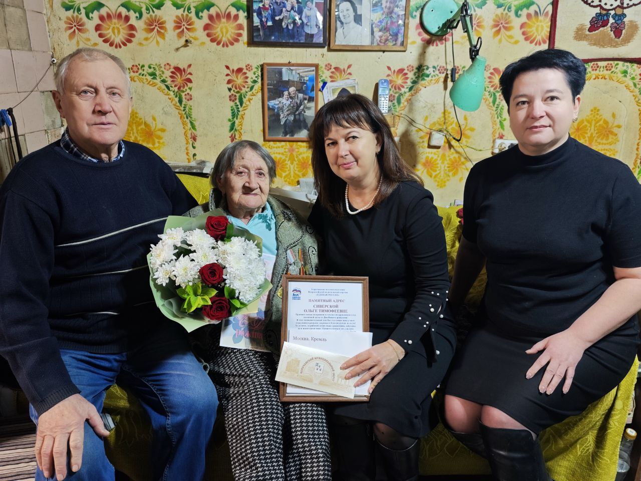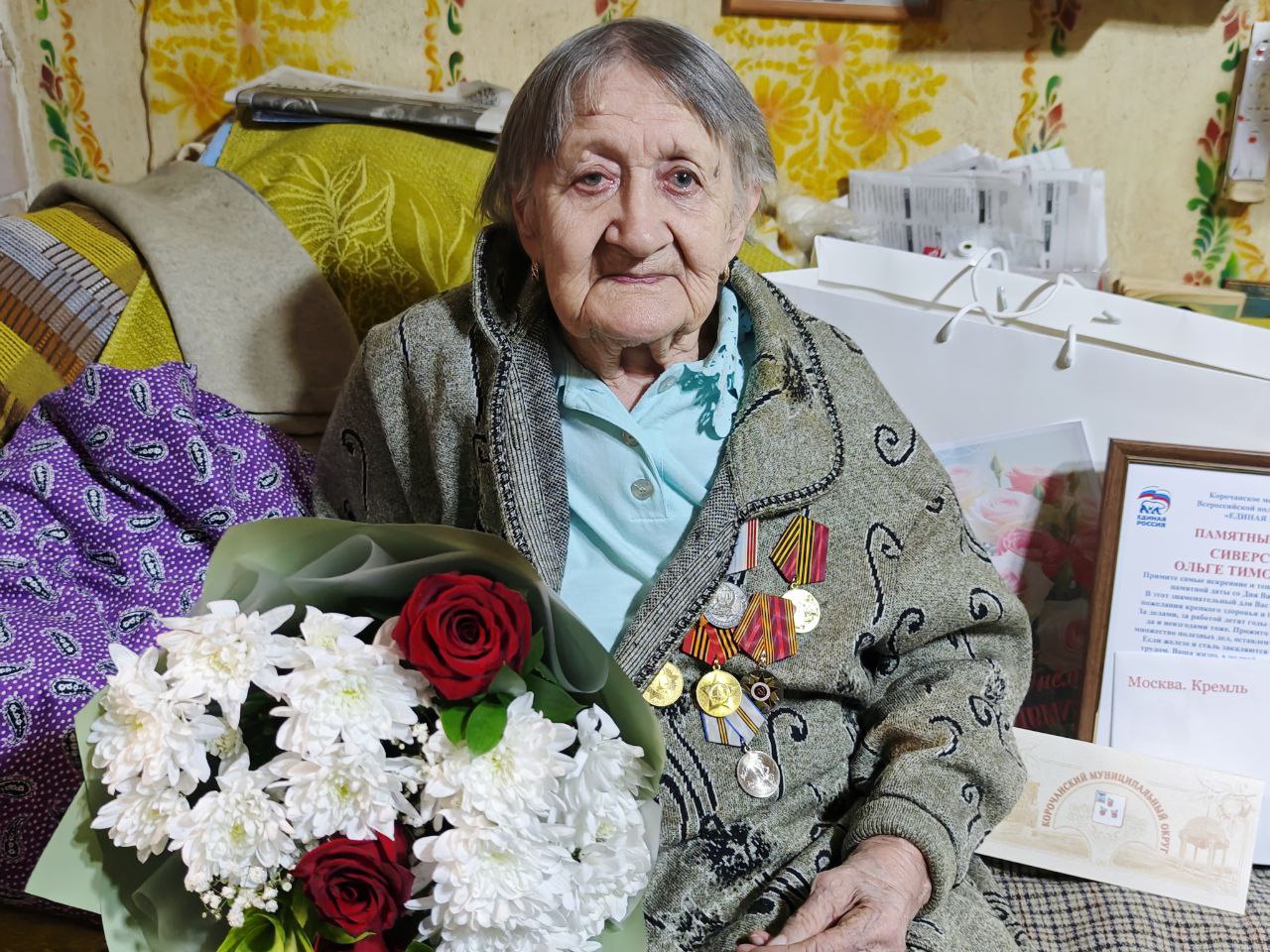 Мой заместитель по социальной политике Татьяна Владимировна Бычихина поздравила именинницу с Днём рождения, передала поздравления лично от меня и от всех наших земляков. Ольга Тимофеевна получила персональное поздравление от Президента Российской Федерации Владимира Владимировича Путина, а также памятный адрес от Корочанского местного отделения Всероссийской политической партии «Единая Россия».