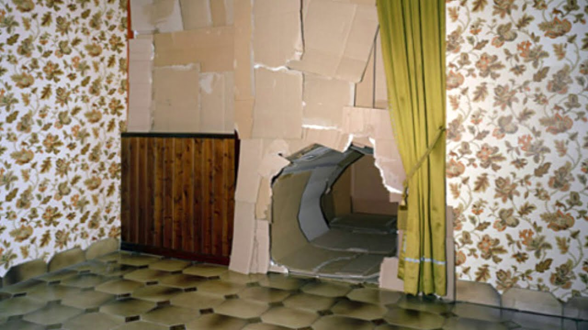 Возможно, этот проект подразумевал нечто иное, однако на старой стене вместо двери соорудили нечто совершенно абсурдное. Какое-то рекордное настроение (или чувство юмора) привело к тому, что картон стал заменителем стройматериалов, и в стене остался лишь лаз в комнату. Похоже, что это решение – своего рода юмористическая находка.