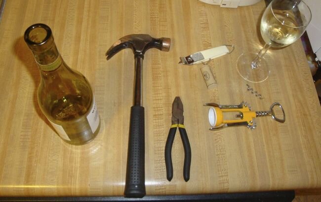 - Длинный винт, отвертка и молоток: Закрутите длинный винт в пробку с помощью отвертки до 2,5 см, затем задней частью молотка аккуратно достаньте пробку.