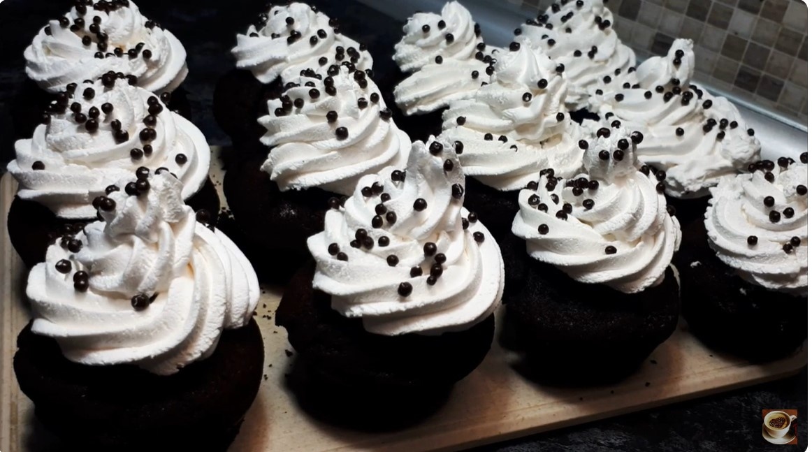 Пока кексы находятся в духовке, можно заняться приготовлением шоколадной глазури и крема на основе сливок. После выпекания с помощью круглой формы вырезаются небольшие отверстия, которые наполняются глазурью, а сверху декорируются сливочным кремом.
