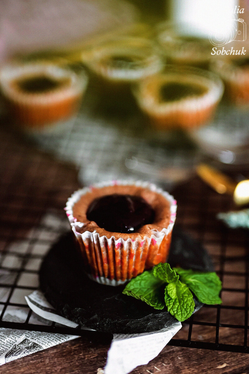 Перед запеканием подготовьте форму для кексов, выложите в каждую по 2 ч. л. основы, аккуратно распределите. Сверху отсадите творожную массу, оставляя немного места. Выпекайте при 180°C 30-50 минут в зависимости от духовки. После выпечки охладите чизкейки, затем добавьте конфитюр из смородины.