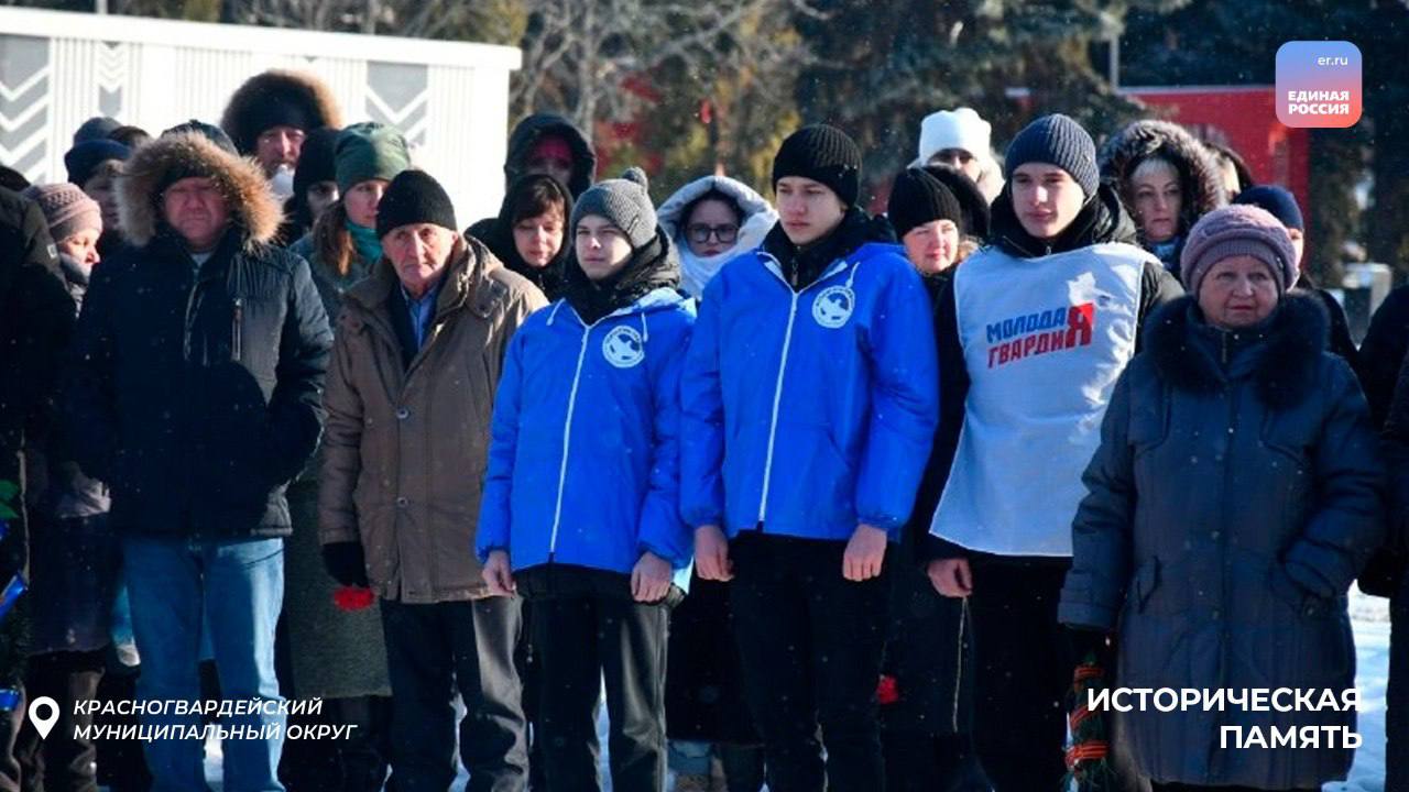 Члены и сторонники Партии, депутаты, молодогвардейцы и местные жители почтили память солдат минутой молчания и возложили цветы к мемориалам Героев-освободителей.