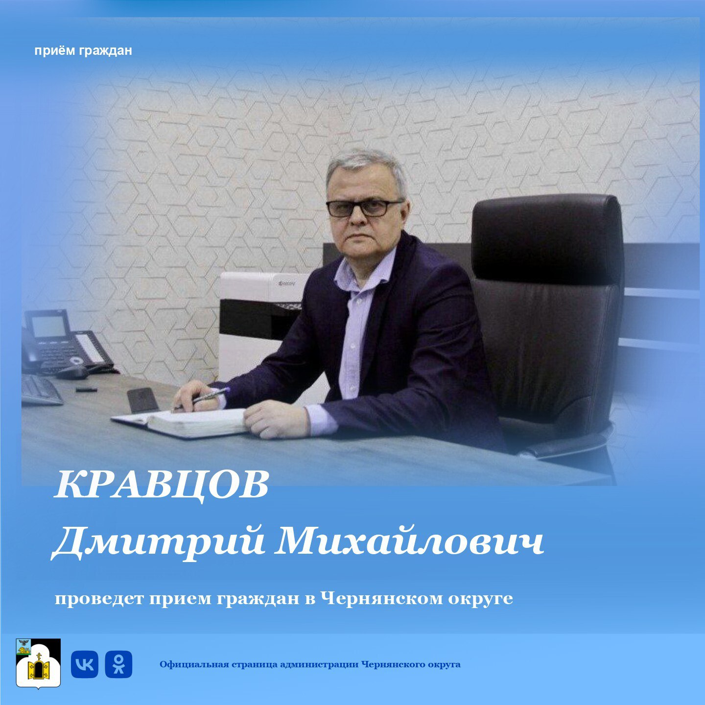11 февраля 2026 года с 10:00 до 12:00 часов начальник управления ветеринарии Белгородской области, главный государственный ветеринарный врач Белгородской области Дмитрий Михайлович Кравцов проведёт личный приём граждан.