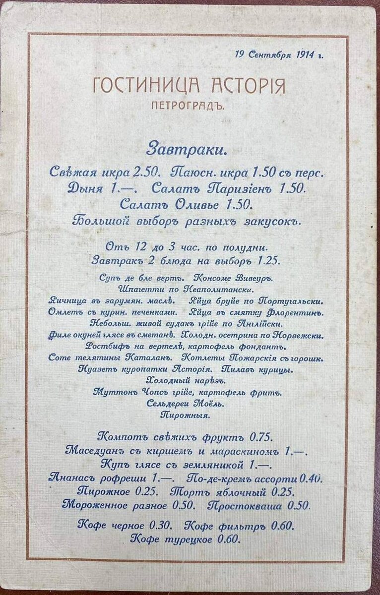 Завтрак в 'Астории' предреволюционного периода был настоящим гастрономическим опытом. Постояльцы могли наслаждаться разнообразными блюдами, среди которых: