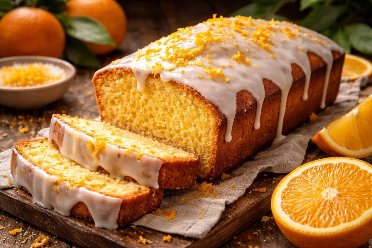 4. Глазурь: Пока кекс остывает, смешать сахарную пудру с соком до тягучей консистенции. Полить остывший кекс сверху — глазурь ляжет ровно и красиво.
